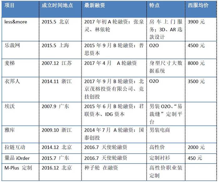 另外,2015年起,国内西服定制市场活跃着一批新起之秀。现将活跃企业整理如下: