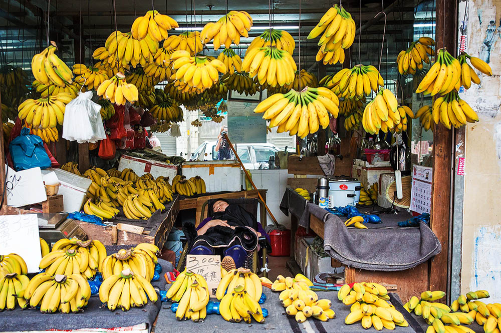 广州市海珠区昌泰路细岗肉菜市场旁,一家专卖香蕉的水果铺,老板娘趁着中午客人不多在店里午休。