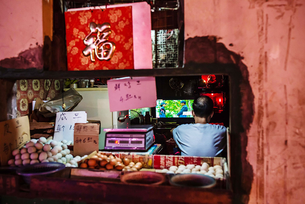 一家专门卖鸡蛋的小店内,老板的注意力全放在了抗日剧上,无心照看店里的生意。