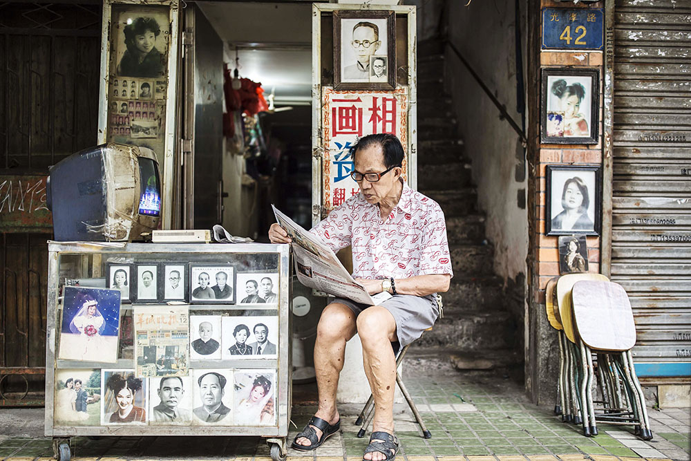 年近八旬的梁任成坐在老相馆档口前看报,铺面门口一台画面时有时无的旧彩电中传来咿咿呀呀的乐曲声。他从1982年开始经营这家相馆,如今已无人来拍摄和冲洗黑白照片。