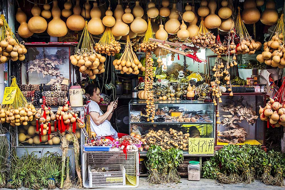 葫芦专卖店里,老板专心地玩着手机。店铺外挂着一串串大大小小的葫芦,十分有趣。