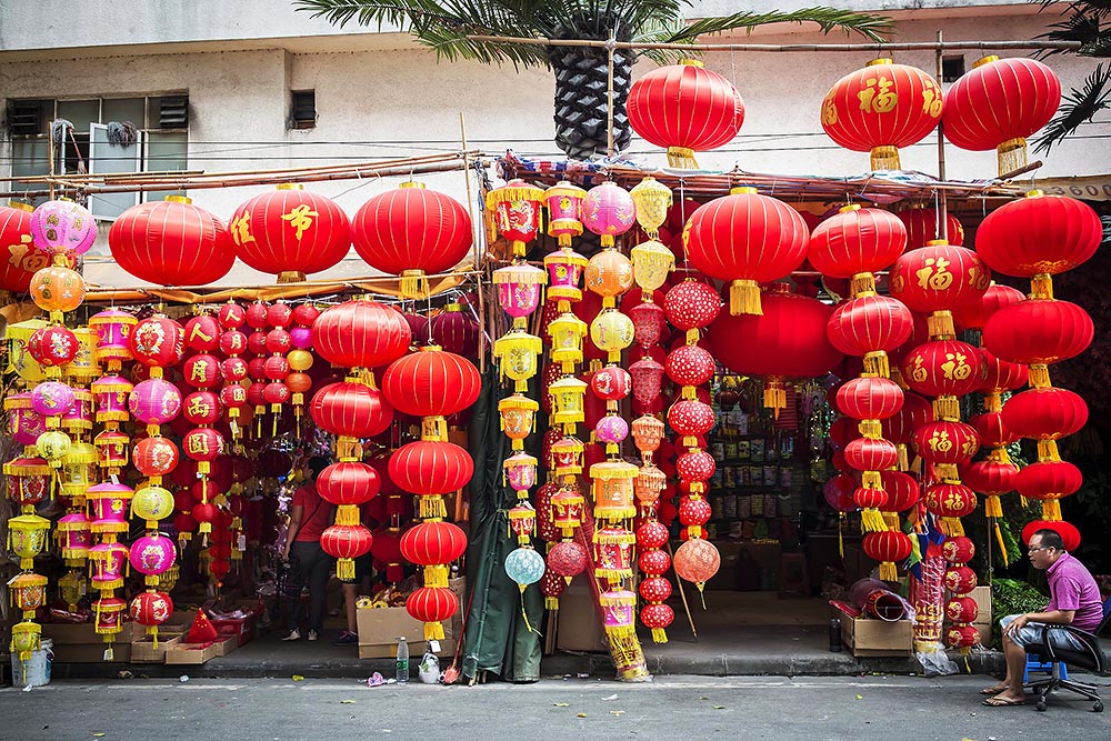 节庆用品专卖店外面挂着各式各样的灯笼,充满了节日气氛。