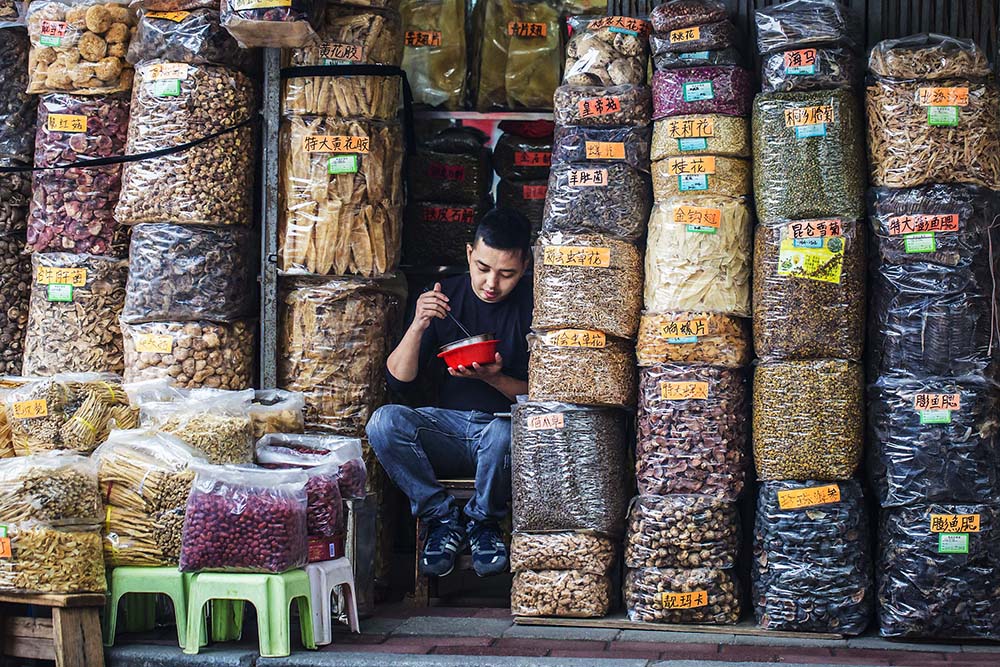 药材市场里,店里的伙计坐在椅子上吃午饭,周围堆满了整包的药材。