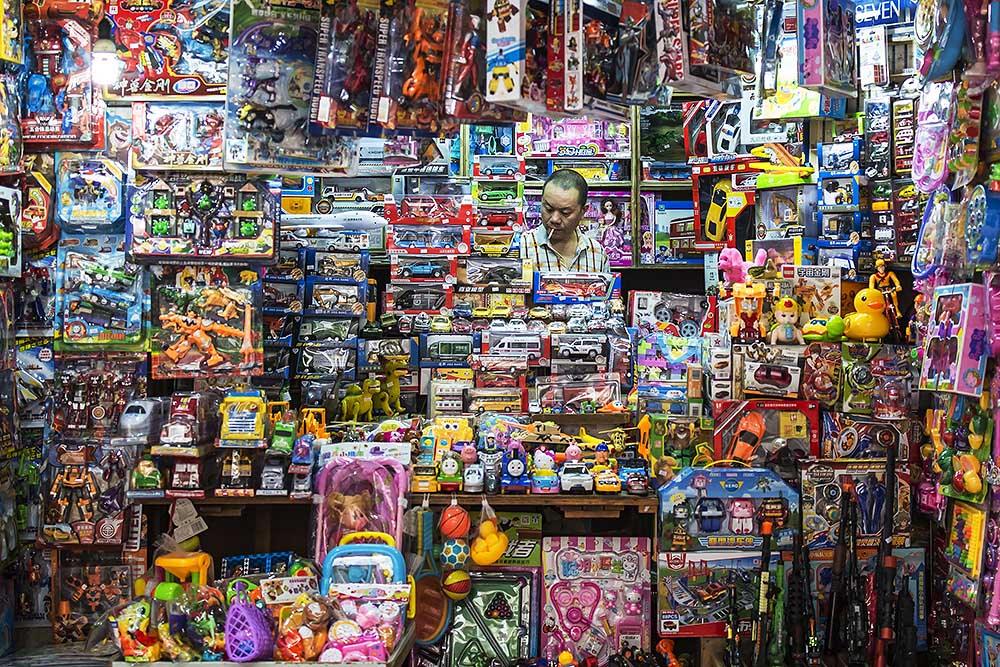 儿童医院附近一家玩具店铺里,各种玩具密密麻麻地堆在一起,小小的店铺简直就是儿童的游乐园。