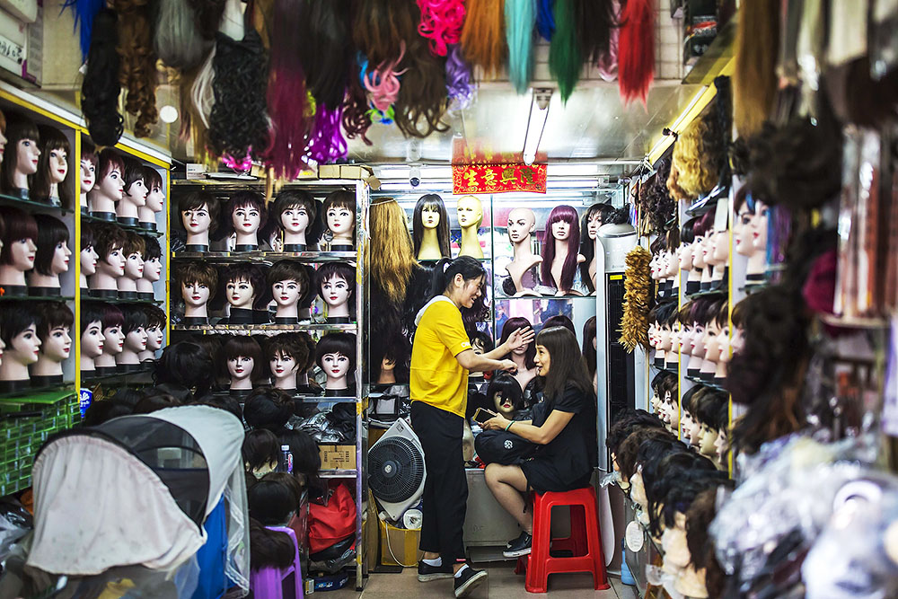美容美发铺,老板在帮她的顾客试戴假发。鲁老板说她开这间小铺是因为喜欢那种帮陌生人排忧解难的感觉。“客人戴上假发后会容光焕发,自信心满满。”她表示,虽然也曾尝试过开网店,但由于很多假发戴在模特的头上和戴在客人头上的效果完全不一样,大部分网购假发的顾客最终都还是会选择退货。“退货还要付运费,很容易亏本。”后来鲁老板索性放弃了网店,专注经营实体店。“买假发一定要来店里亲自试用过,才知道好看不好看。”