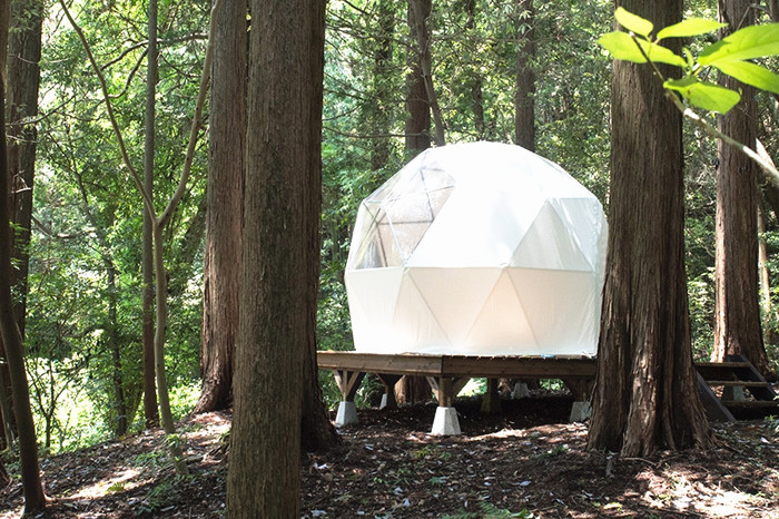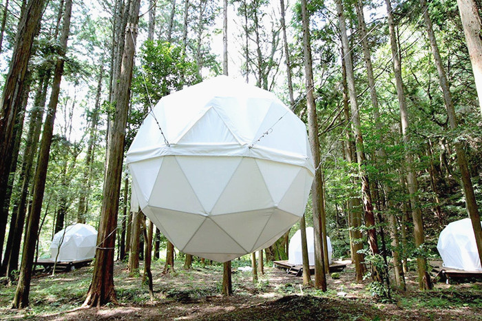 悬浮式球体帐篷是最吸引人们目光的,在两棵树之间悬挂着一个球体帐篷,有一种躺在吊床上的感觉。帐篷内有两张床,躺在上面便能看见天空和树林,呼吸着新鲜的空气,别有一番趣味。球体帐篷只有一顶,面积约6.8平方米,入住费稍比半球形帐篷贵一些,每晚1255元人民币。想要体验悬浮在空中,周围绿树环绕的人们,快速速预定这款火爆帐篷。