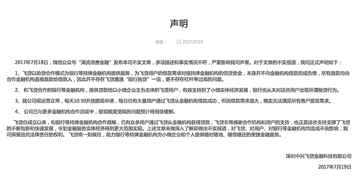 今年7月,又有报道称,飞贷由于杠杆率过高,其合作银行抽贷导致资金链断裂。紧接着,“坏账多“、”风控有问题“……种种猜测和怀疑纷至沓来。