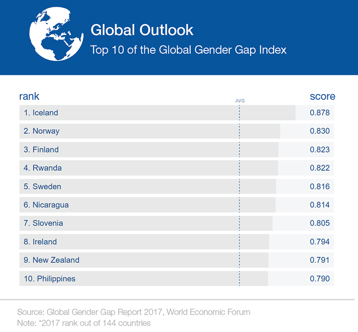 报告对全球144个经济体的性别差距状况进行排名,冰岛蝉联榜首,成为全球性别最平等的国家,北欧国家挪威、芬兰、瑞典均排进前五,卢旺达因其突出的女性参政表现位列第四。排在第6位的尼加拉瓜和第7位的斯洛文尼亚都首次取得了消除80%性别差距的佳绩。爱尔兰、新西兰和菲律宾分列8至10位。