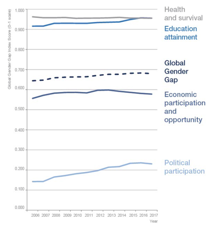 自2006年首版报告发布以来, 《全球性别差距报告》每年对女性在教育程度、健康与生存、经济机会与政治赋权四大指标进行测评并排名。今年的最新报告显示,全球68%的性别差距已消除,略低于2016年的68.3%和2015年的68.1%。