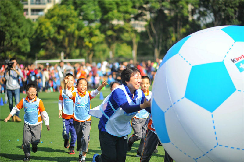 他们一同尝试了头顶巨型足球折返跑接力、九宫格射门与七人足球赛,孙雯还在现场进行了指导,向学生演示踢球的正确姿势。赛后孙雯表示,与学生一起运动很开心,同时强调运动的意义。“运动能够帮助每个人了解团队,促进交流与成长,希望孩子们能够享受运动的快乐。”