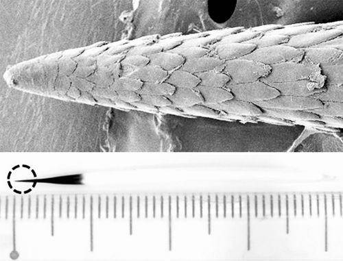 豪猪刺尖端的放大图,可以看到微小的倒刺