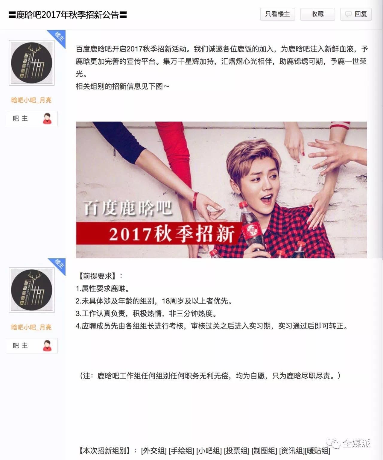 从这个月鹿晗吧的秋季招新公告可以看到,外交组、手绘组、小吧组、投票组、制图组、资讯组与暖贴组分工明确。并且,加入团队的流程也相当严格:首先得符合鹿晗唯饭(注:唯饭,即粉丝只喜欢明星组合中的某一人,而对组合中其他人不感兴趣)的身份,由各组组长进行审核,过关后进入实习期,实习通过后才可以转正。