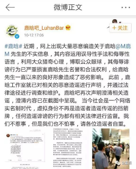 对于随之而来的各种谣言,鹿晗吧也迅速用截图方式给出澄清,并以法律的名义给出强硬的态度。