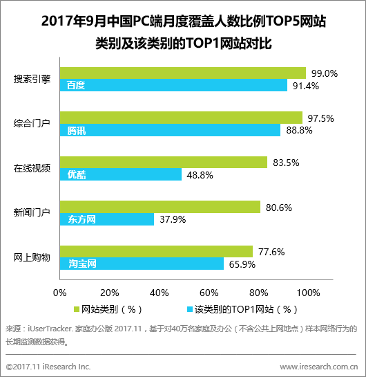 其中,使用搜索引擎和综合门户网站的人数比例最高,分别为99.0%和97.5%,占据PC端流量主入口。在线视频、新闻门户以83.5%和80.6%分列三、四位。购物类网站相对较低,为77.6%。从各类别的TOP1网站来看:百度、腾讯、淘宝网的覆盖人数比例分别为91.4%、88.8%、65.9%,PC端领先地位明显。而在视频和新闻门户类网站中,TOP1网站优酷和东方网的覆盖比例均未超过50%,分别为48.8%和37.9%,与该类别总覆盖人数比例相差较多。由此可见,虽然PC端用户较为关注视频和新闻类别,但网站选择上相对分散,集中度较低。