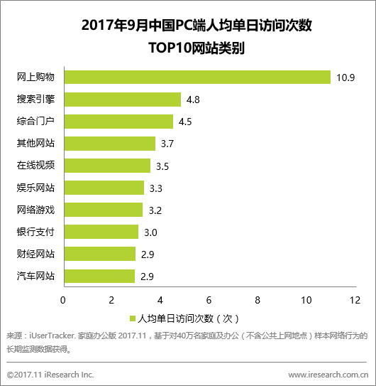 使用频次:网上购物遥遥领先,人均单日访问10.9次