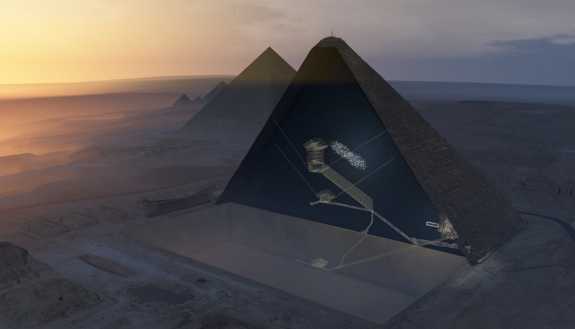 研究人员们采用宇宙线μ子成像检测技术对胡夫金字塔进行了非侵入式探测。经过两年的探测和数据分析结果显示,金字塔中存在一个大型中空结构,至少有30米长、数米高,横截面类似金字塔下方的大甬道。