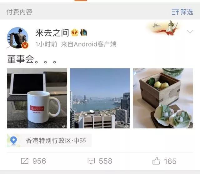 今天中午,微博CEO王高飞用“来去之间”的账号发布了一条微博。这条包含有三张图片的微博显示出了诸多不同之处。比如,三张图片在小图状态均可见,但要点开第二张与第三张图片看大图却出现了“开通Ta的专属会员即可浏览图片和Ta的全部付费内容”的字样。此外,右上角的筛选里也增加了付费内容的选项。