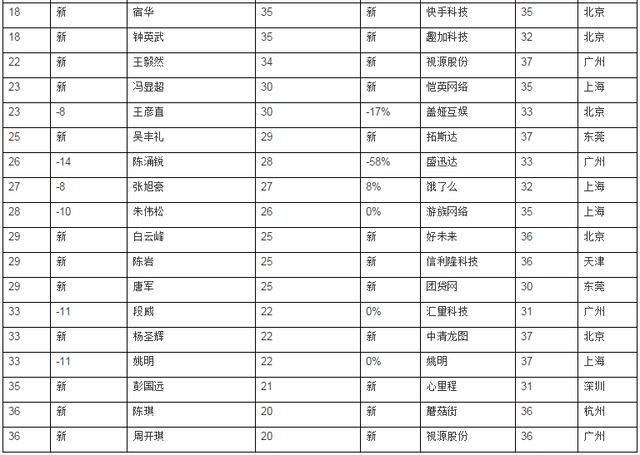 9位做在线游戏,包括:游族网络林奇和朱伟松、英雄互娱应书岭、恺英网络王悦和冯显超、趣加科技的钟英武、盖娅互娱王彦直、盛迅达的陈涌锐和中清龙图的杨圣辉。