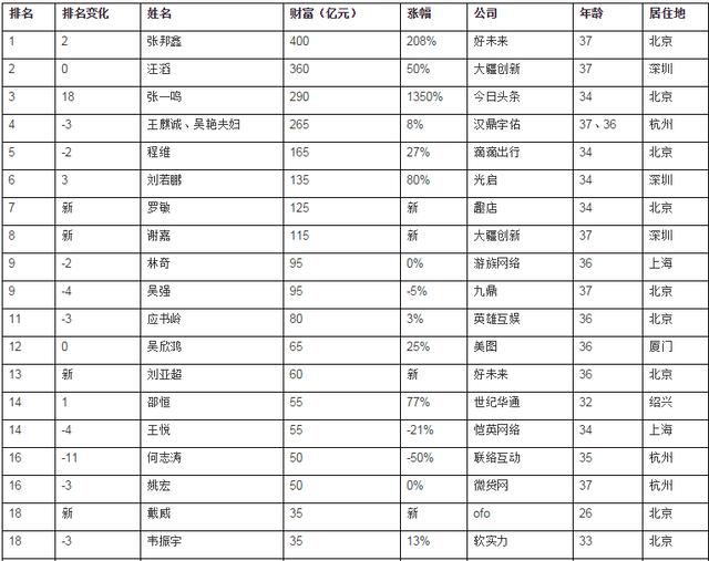 排名第二的是大疆37岁的汪滔,以360亿元位列今年胡润百富榜第55名;再次是今年涨幅最大的今日头条34岁的张一鸣,以290亿元位列今年胡润百富榜第83名。汉鼎宇佑的吴艳是唯一一位上榜的80后女性创业者。