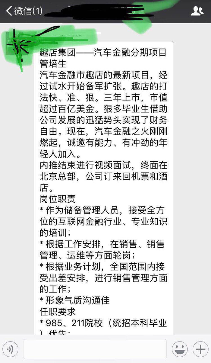 11月3日,网友爆料,趣店集团正在计划开展汽车金融业务。该名网友称,在其校友群中接到趣店的招聘信息,趣店称将开展最新项目——汽车金融,且该项目已经经过试水准备扩张。趣店的招聘信息中显示,招聘岗位为储备管理人员,将根据工作安排,在销售、销售管理、运维等方面轮岗,然后根据业务计划,全国范围内接受出差安排,进行销售管理方面的工作。