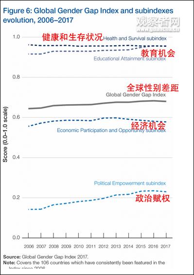 自2006年以来,WEF每年都会发布《全球性别差距报告》,对女性的教育机会、经济机会、政治赋权以及健康和生存状况进行了测评并排名。今年的最新结果显示,与去年相比,四项指标指数均有所下滑,其中经济与参政机会的下滑幅度尤其明显。