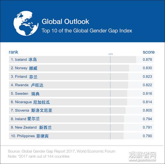 而毫不意外的是,北欧小国继续组团霸占榜首。冰岛连续9年位列第一,成为全球性别最平等的国家,挪威和芬兰紧随其后,而瑞典则排名第五。