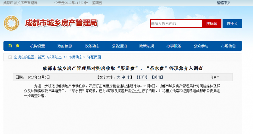 为进一步规范成都房地产市场秩序,严厉打击商品房销售违法违规行为,11月3日,成都市城乡房产管理局针对网络媒体及群众反映购房收取“渠道费”、“茶水费”等现象,已对2家涉及问题开发企业进行了约谈,并将相关线索和证据移送成都市公安局进一步调查处理。