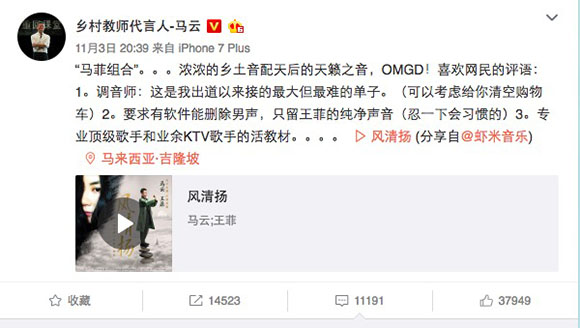 11月3日,马云和王菲合唱的《风清扬》在虾米音乐独家首发,一时被刷屏。马云现在的作品不只有阿里巴巴了。