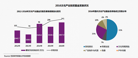 根据艺恩网2017年初发布的《金融业与泛娱乐产业融合白皮书》,截止2016年底,泛娱乐产业整体规模突破5000亿元,消费用户达10亿人次。巨大的市场空间吸引了大批金融资本进入泛娱乐产业。2016年,文化产业基金新增241支,募集规模达264.5亿元,同比增长27%。