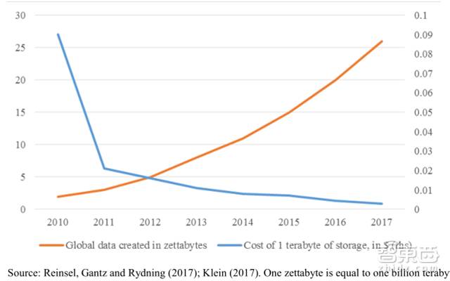 ▲2009-2017年间全球数据存储成本(蓝线)和数据可用性(红线)发展示意