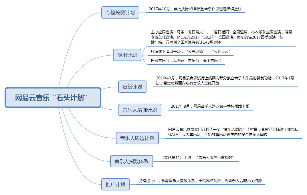 可以肯定的一点是,网易云音乐对于“石头计划”项目的重视程度很高,其优先级已经被列于其他许多项目之上。团队投入了大量人力、物力、财力,围绕七大子计划逐步推进,其中,又以与音乐人发展最为紧密的两个计划,专辑投资计划和演出计划,作为重中之重,投入最多。