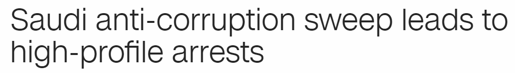 【沙特反腐至少17名王子和高级官员被捕】4日晚,沙特王储穆罕默德·本·萨勒曼宣布成立最高反腐委员会,根据CNN获得的最新名单,反腐委员会已经逮捕了至少17名王子和高级官员。这个名单包括王室控股公司的Alwaleed bin Talal王子,他拥有95%的王国控股公司,该公司在全球范围内持有花旗集团,推特,苹果和新闻集团等全球性公司的股份。至少有38名前任,现任和副大臣因涉嫌腐败而被捕。CNN已获得名单上的17名人士的名字,包括皇家法院前领导人Khaled Al-Tuwaijri,沙特媒体大亨易卜拉欣和本·纳赛尔亲王。三名大臣被免职,其中包括经济和计划大臣,国民卫队大臣和海军司令。