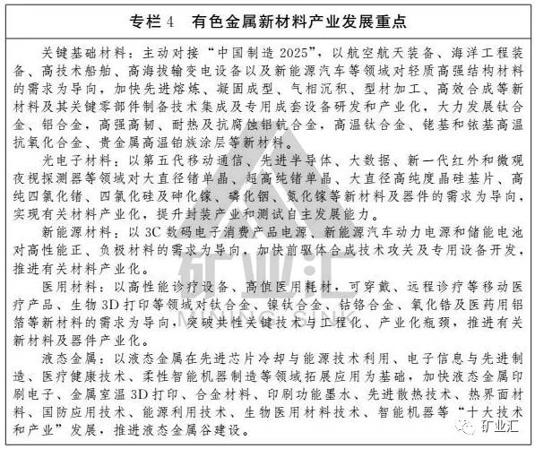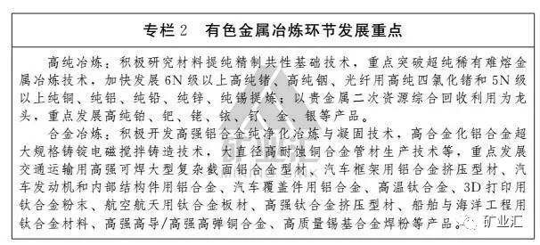 重点发展高纯稀有、稀贵金属,鼓励发展铜、铝、铅、锌、锡等常规有色金属高纯产品。以提升产品质量和性能为导向,大力发展有色金属合金产品。