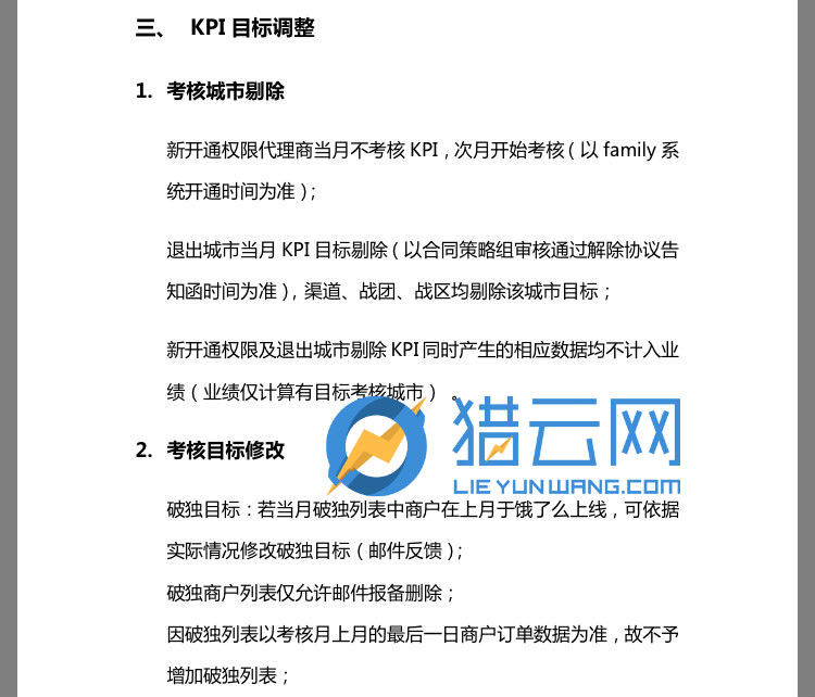 根据饿了么《城市代理KPI白皮书》第三项显示,考核城市剔除。新开通权限代理商当月不考核KPI,次月开始考核(以 family 系统开通时间为准);退出城市当月KPI目标剔除(以合同策略组审核通过解除协议告知函时间为准),渠道、战团、战区均剔除该城市目标;新开通权限及退出城市剔除 KPI 同时产生的相应数据均不计入业绩(业绩仅计算有目标考核城市) 。