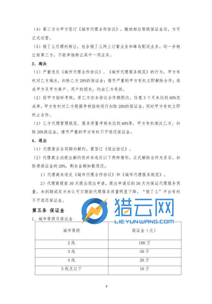 根据饿了么在合同中提及的违约责任方面的表述,乙方未达到甲方考核指标要求,甲方有权扣除乙方20%的保证金并单方面解除本协议,这就意味着通过保留随时清退的权力,合同约定存续时间形同虚设,清退政策把拓展市场的风险极大地转嫁给了代理商,一旦在烧钱推广时期被清退,前期高额投入有可能血本无归,保证金的退还也存在风险。