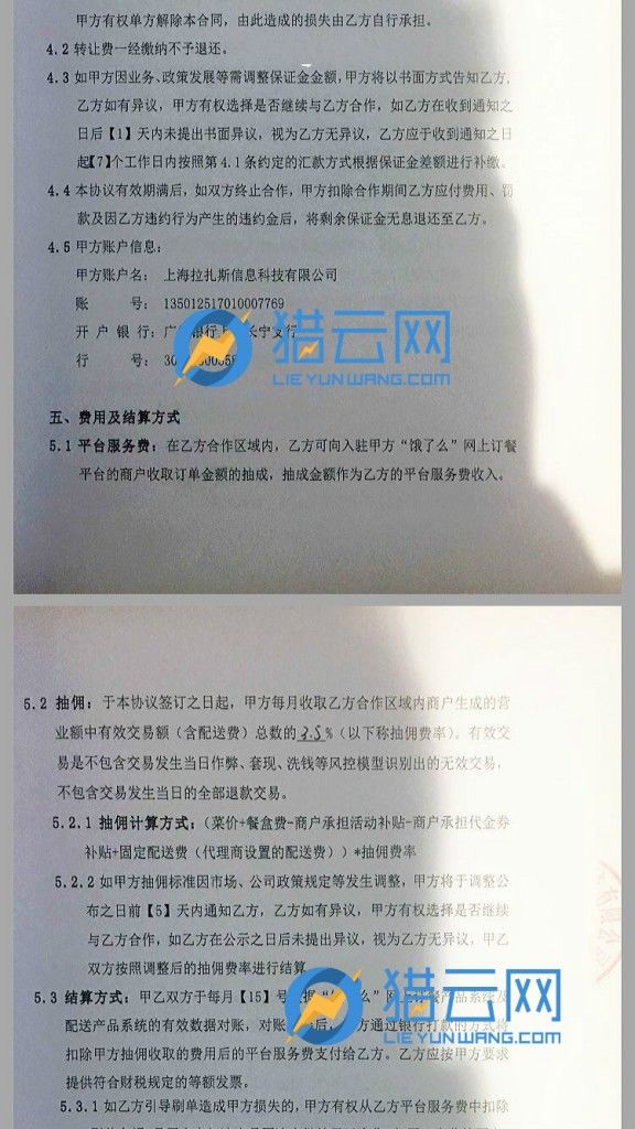 值得关注的是,饿了么总部以合同的规定来阻止代理商们继续维权,猎云网发现这份城市代理合作协议在双方签署后,本应一式两份,甲乙双方各持一份,但饿了么以盖章为由并未给予代理商,这些代理商在向公司拿回合同时,回复的情况均是丢了,或是需要再重新签署等类似的表述。“我3月份签的合同,到现在都过去7个月了,依旧未收到”,代理商方某无奈的对猎云网说。