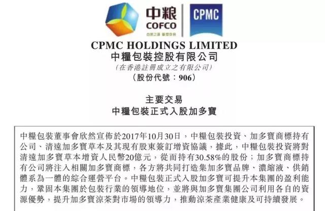 8月10日中粮集团旗下的中粮包装发布公告称,附属中粮包装投资与清远加多宝草本植物科技及其现有股东订立框架协议,附属拟投资清远加多宝,以换取清远加多宝约30%股权。