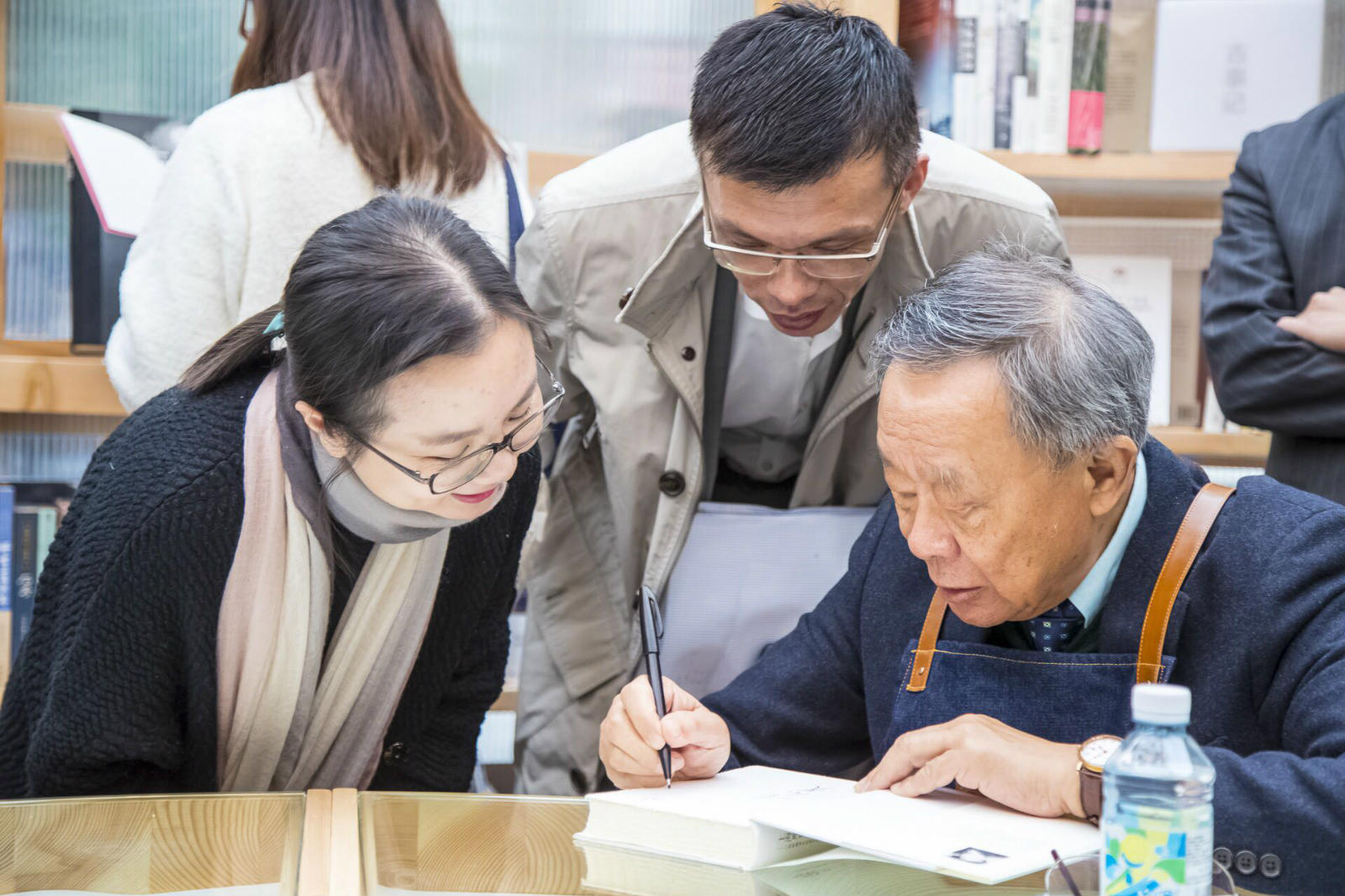“方灯越大,表明这个种类下的图书越多,如果书买走了,接下来还会补上新的,”来自世纪出版集团世纪文景的选书师沈宇,穿着标识着“思南书局”的蓝色牛仔工作围兜,一边忙碌地在书架间周转,一边对界面文化(ID:BooksAndFun)的记者说。为了兼顾复兴路周围的亲子人群,沈宇说,他们特别在书架底部放置了许多儿童类图书。书店的角落里,第一批次进入的读者已经将李欧梵围成一圈,李欧梵的太太穿着特别为这次活动准备的绿色旗袍,站在人群之外。