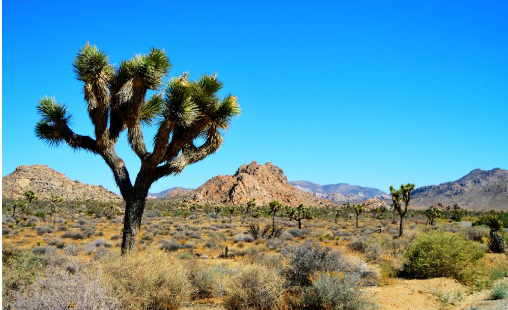 约书亚树国家公园位于加州南部,处于两大沙漠的一部份,所以包含了两大生态系统。公园东部是科罗拉多沙漠范围,长满了木馏油灌木,墨西哥刺木(ocotillo)和多刺仙人掌(cholla)。公园西部更高,更潮湿,处于稍微凉爽些的莫哈维沙漠范围,是约书亚树的特殊产地。