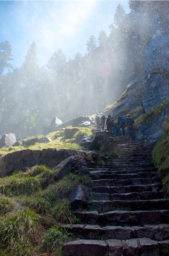 脚下踩着的是由千年落叶积成的柔软腐殖土,呼吸着潮湿而清新的空气,没有工业废气的污染,没有城市嘈杂的喧嚣,宁静而自然,使身心得到超脱和升华,仿佛在进行“森林浴”。