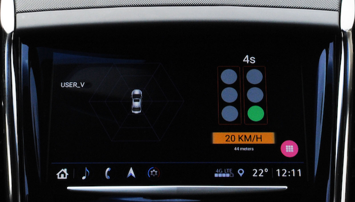 基于V2X应用层行业标准开发的绿灯优化车速提醒安全应用,可以向司机发送到达下一路口的最佳车速,车辆以此速度前进便可在绿灯状态下通过路口。这项应用可以帮助司机避免由于视线被前方大型车辆遮挡而无法获知红绿灯信息导致的紧急刹车情况,或者通过更好地控制车速顺利通过交叉路口。