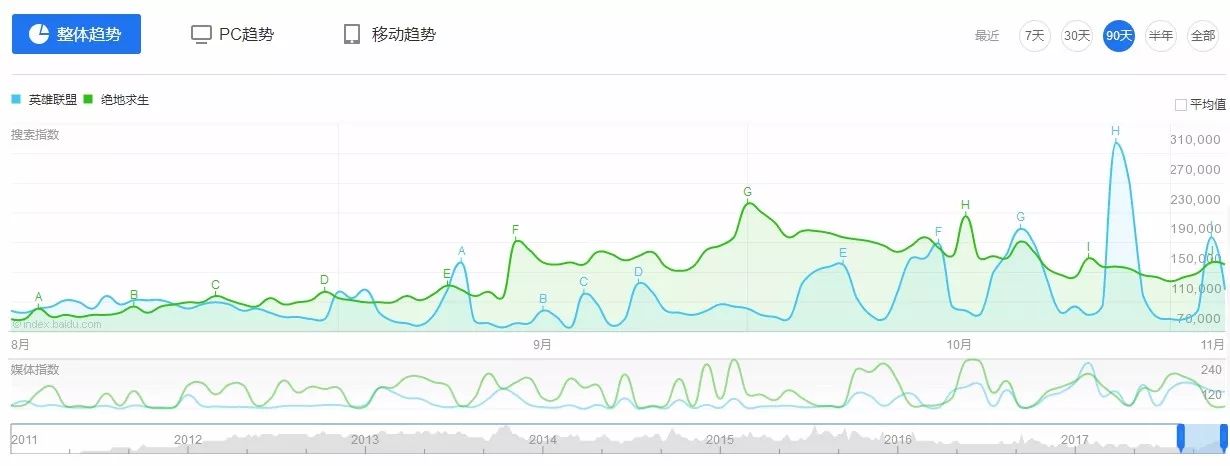一个游戏的火爆,势必会影响到市场上的其他游戏,抢占其原本的市场和用户,腾讯的《英雄联盟》就受到了《绝地求生》的冲击。由百度指数可以看出,《绝地求生》在爆火之后,整个9月份的热度都超过了《英雄联盟》,10月底,《英雄联盟》因S7赛季热度短时间反超,但其余时间仍难敌《绝地求生》。