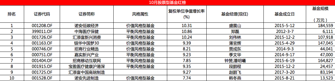 界面新闻从收益率、波动率、择时与选股四个维度综合评估,形成月度基金红黑榜,并对上榜基金进行长期跟踪,试图从中找到收益相对较高、风险相对较低,长期业绩优秀的基金。下面为10月综合得分最高的10只股票型基金:
