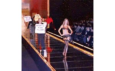 当年Gisele Bündchen(吉赛尔·邦辰)因为代言了皮草品牌Blackglama,走秀的时候善待动物组织的4个狂热分子居然直接上台抗议,还说她是皮草的败类,但天神面不改色地走完了全场。