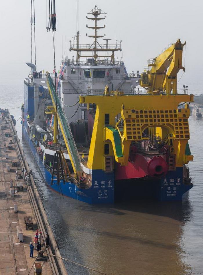 刚刚下水的“天鲲号”全船长140米,型宽27.8米,型深9米,最大挖深35米,绞刀电机最大功率可达7500千瓦。这些数据决定了它是当之无愧的亚洲最大自航绞吸挖泥船。