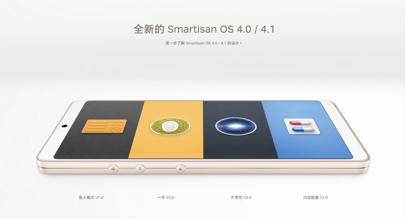 在发布会上锤子科技还展示了新版的Smartisan OS 4.1系统,新增了无障碍模式,原来的三大功能一步(One Step)、大爆炸(Big Bang)、闪念胶囊(Idea Pills)也都得到了升级。