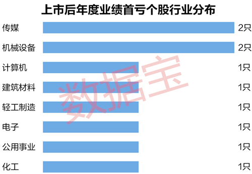 这些上市后年度业绩预计首亏股分布于8个申万一级行业,其中,传媒、机械设备各包含2只,其他行业均包含1只。