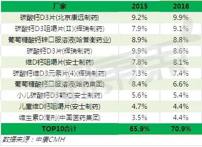 TOP10产品中,北京康远制药的碳酸钙D3片排名首位,2016年份额为9.9%,份额同比上行约0.8个百分点,辉瑞制药的碳酸钙D3咀嚼片(Ⅱ)排名次之,2016年份额为9.1%,份额同比上行1.2个百分点。排名前10的产品之间差距并不明显,市场竞争激烈。