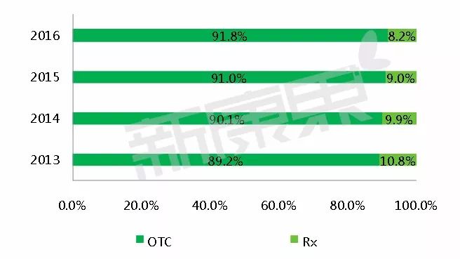 2013-2016年骨质疏松药物OTC/RX占比变化情况