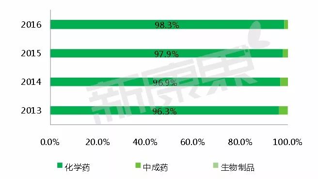 2013-2016年骨质疏松药物中西药占比变化情况